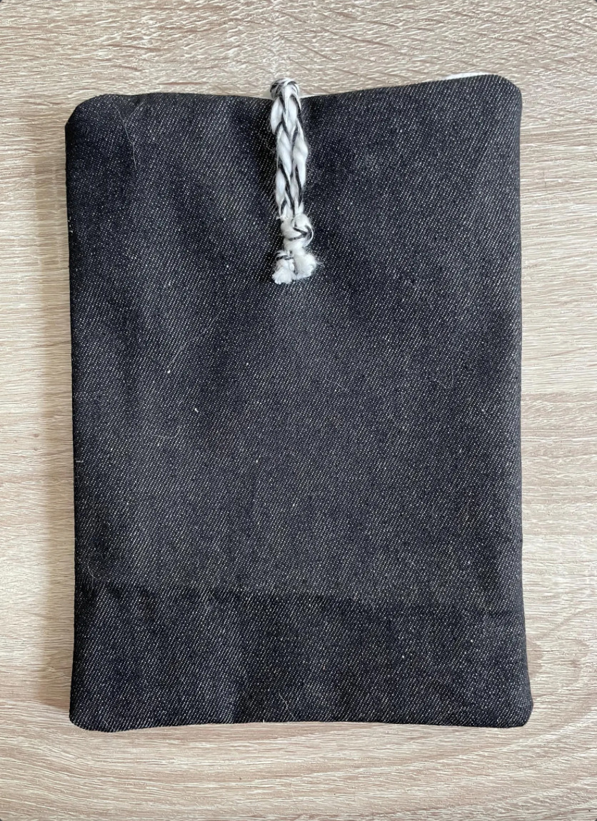 Matières : denim, doublure pongée 100% polyester, fils à broder, fil 30% laine et 70% acrylique, bouton