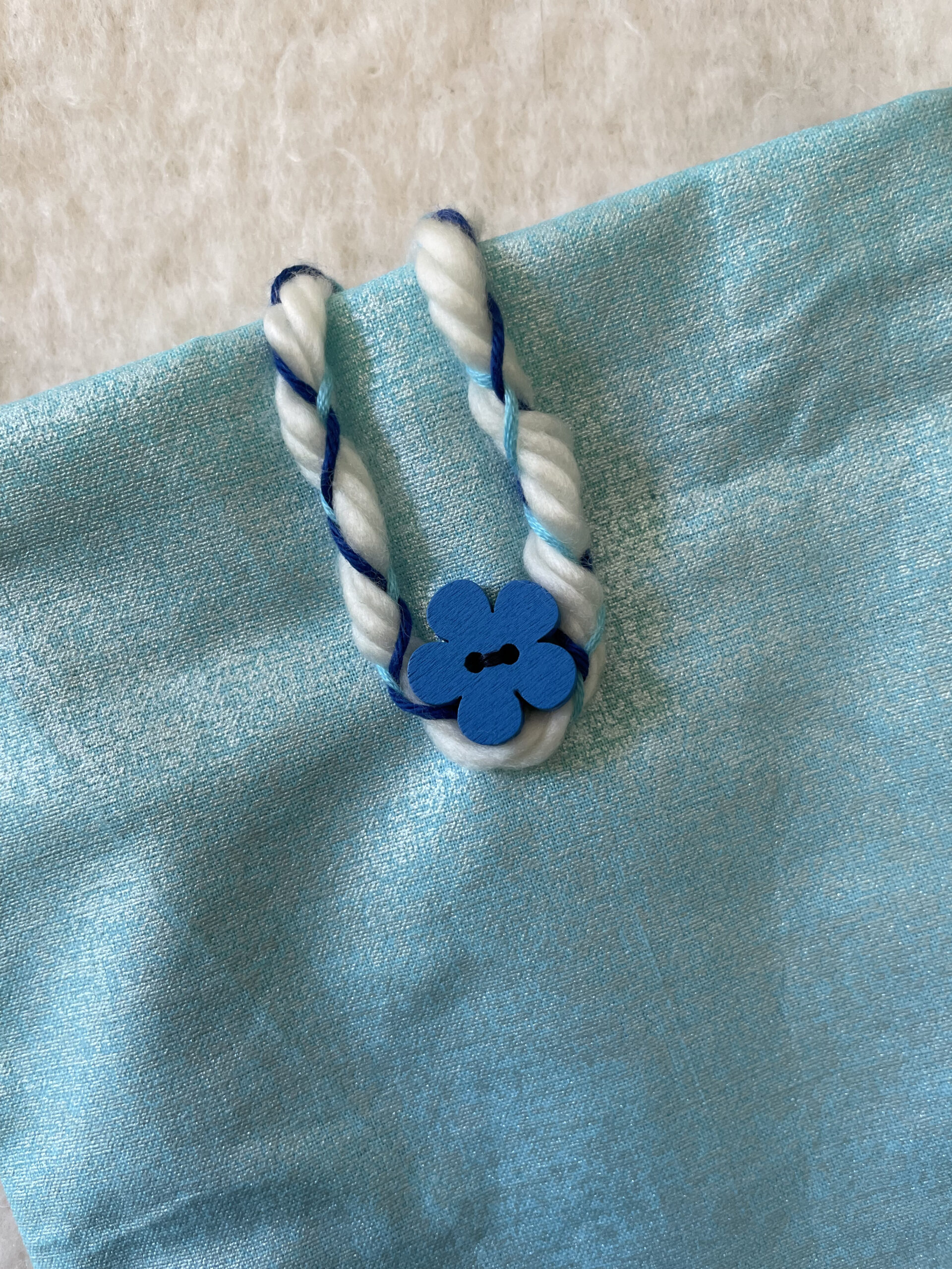 Matières : 100% coton, doublure 100% coton, fils à broder, fil 30% laine et 70% acrylique, bouton